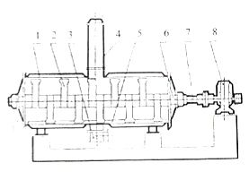 結(jié)構(gòu):真空耙式干燥機(jī)的主要部件1、殼體 2、耙齒 3、出料裝置 4、加料裝置 5、粉碎棒 6、密封裝置 7、攪拌軸 8、傳動(dòng)裝置
